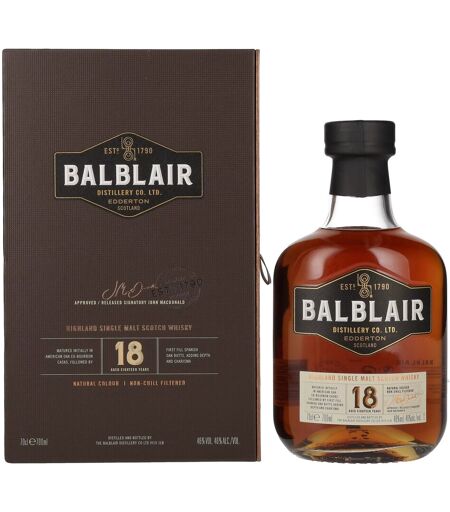 Balblair, de oudste distilleerderij in de Northern Highlands van Schotland sinds 1790, ligt op een afgelegen heuvel met uitzicht op de Dornoch Firth. Deze historische distilleerderij ligt op een oude Pictische ontmoetingsplaats, bewaakt door de mysti Kleur: Geolied cederhout. Neus: Rijke toffee, rijpe peren, tonen van leer. Smaak: Evenwichtig, sappige abrikozen, vanillepudding, gekruid eikenhout. Afdronk: Langdurig, verwarmend, verse specerijen, sultana's. (automated translation) ...