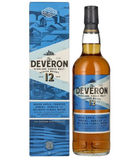 Deveron is een single malt whisky van hoge kwaliteit, geproduceerd in de befaamde MacDuff distilleerderij in Aberdeenshire, Schotland. De distilleerderij werd opgericht in 1960 of 1962 en haalt het water dat nodig is voor de whiskyproductie uit de Ge Kleur: Goud. Neus: Zacht, romig, kruidig. Smaak: Zoet, licht fruitig, tonen van toffee, vanille en eikenhout. Afdronk: Langdurig, droog, zacht. (automated translation) ...