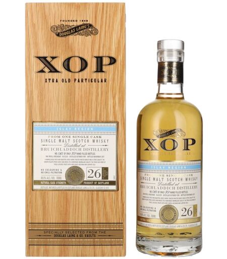 De XOP - Xtra Old Particular serie van Douglas Laing vervangt de Director's Cut serie, die bestaat uit speciaal geselecteerde en zeldzame single malts en single grain Scotch whisky's. De Douglas Laing XOP Bruichladdich 26 Years Old is een uitzonderl Kleur: Rijk goud met amberkleurige reflecties. Neus: Complex en elegant met tonen van honing, rijpe appels, vanille, zeezout en fijne nuances van eikenhout. Smaak: Zacht en gelaagd met aroma's van gedroogd fruit, karamel, crème brûlée, moutsuiker e ...