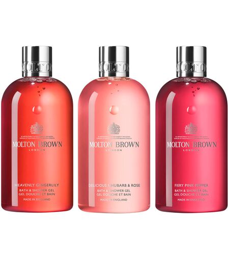 Exotisch, sprankelend, sensueel - het Molton Brown Body Wash Trio Deze veelzijdige set combineert drie geuren met een sterk karakter en biedt een luxe verzorgingservaring voor elk moment van de dag. De combinatie van bloemige, fruitige en kruidige nuances voegt variatie toe aan je dagelijkse huidverzorgingsroutine - perfect om te ontdekken of cadeau te geven. Heavenly Gingerlily voert je mee naar exotische sferen met noten van tuberoos, gember en sandelhout - een sensuele, zacht kruidige geur met diepte. Delicious Rhubarb & Rose combineert pittige rabarber met fluweelzachte roos - een verrassend levendige en toch delicaat fruitige geur. Fiery Pink Pepper maakt indruk met een kruidig-bloemige compositie waarin roze peper samenkomt met gember, patchoeli en warme ambertoetsen - vol energie en zelfvertrouwen. Inhoud set: - 1 x Hemelse Gingerlily Bad & Douchegel, 300 ml - 1 x Heerlijke Rabarber & Roos Bad & Douchegel, 300 ml - 1 x Vurige Roze peper bad- en douchegel, 300 ml Een ideaal cadeau voor parfumliefhebbers - of als persoonlijke voorraad voor een luxueuze douche-ervaring met een verschil. ...