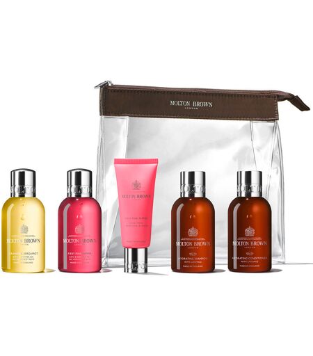 Een handbagagevriendelijke vijfdelige set voor globetrotters. In een transparante toilettas gemaakt van gerecycled materiaal, biedt deze selectie de luxe lichaamsverzorging die je gewend bent op je volgende reis. Dankzij onze kenmerkende reistas, gevuld met je favoriete schatten in miniatuurformaat, zal de luxueuze flair van Molton Brown je altijd vergezellen, waar je avonturen je ook brengen. Stralend. Compact. Duurzaam. Deze set bevat: Orange & Bergamot Bath & Shower Gel 100ml.Vurige Roze Peper Bad- & Douchegel 100 mlHydraterende shampoo met kamille 100 mlHydraterende Conditioner met Kamille 100 mlVurige Roze peper Handcrème 40 ml ...