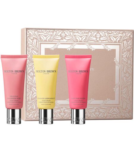 De Molton Brown Hand Cream Trio is een handverzorgingsset met drie uniek geurende handcrèmes. De handcrèmes worden geleverd in een feestelijke verpakking, waardoor de set ideaal is om cadeau te geven. Molton Brown Hand Cream Trio bevat: 1 x Molton Brown Vurige Roze Peper Handcrème, 40ml1 x Molton Brown Sinaasappel & Bergamot Handcrème, 40 ml1 x Molton Brown Heerlijke Rabarber & Roos Handcrème, 40 ml ...