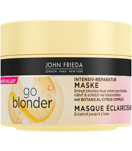 Verheldert, voedt & beschermt blond haar onmiddellijk tegen haarbeschadiging. Geeft direct glans - Voor gebruik op natuurlijk blond en geblondeerd haar. De Go Blonder lijn van John Frieda is speciaal ontwikkeld voor blond en geblondeerd haar en bevat naast de behandeling ook shampoo, conditioner en een oplichtende spray. Toepassing: Breng het masker royaal aan na het wassen met Go Blonder Shampoo en kam het door. 2-3 minuten laten inwerken - grondig uitspoelen. ...