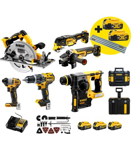 Combopack bestaat uit: * Incl. 3x 5,0Ah accu * DCD796 koolborstelloze accu schroefboormachine * DCF840 koolborstelloze accu slagschroevendraaier * DCS356 koolborstelloze accu multitool * DCS572 koolborstelloze accu cirkelzaag machine * DCH273 koolborstelloze accu combihamer SDS-plus * DCG405 koolborstelloze accu haakse slijper * Incl. lader en trolley DCD796 accu schroefboormachine * Onbelast toerental 0-550/2.000tpm * Max. koppel 27Nm * Max. boorcapaciteit metselwerk/metaal/hout: 13/13/40mm DCF840 accu slagschroevendraaier * Onbelast toerental 0-3.200tpm * Max. koppel 192Nm DCS356 accu multitool * Oscillatie snelheid 0–13.000/16.000/20.000tpm * Oscillatiehoek 3,2deg DCS572 accu cirkelzaag machine * Onbelast toerental 0-5.500tpm * Max. snijdiepte 45º/90º: 44/58mm * Compatibel met DeWALT geleiderail DCH273 accu combihamer SDS-plus * Onbelast toerental 0-1.100tpm * Max. boorcapaciteit metselwerk/metaal/hout: 24/13/26mm DCG405 accu haakse slijper * Onbelast toerental 0-9.000tpm * Schijf Ø 125mm Combopack bestaat uit: * Incl. 3x 5,0Ah accu * DCD796 accu schroefboormachine * DCF840 accu slagschroevendraaier * DCS356 accu multitool * DCS572 accu cirkelzaag machine * DCH273 accu combihamer SDS-plus * DCG405 accu haakse slijper * Incl. lader en trolley DCD796 accu schroefboormachine * Onbelast toerental 0-550/2.000tpm * Max. koppel 27Nm * Max. boorcapaciteit metselwerk/metaal/hout: 13/13/40mm DCF840 accu slagschroevendraaier * Onbelast toerental 0-3.200tpm * Max. koppel 192Nm DCS356 accu multitool * Oscillatie snelheid 0–13.000/16.000/20.000tpm * Oscillatiehoek 3,2deg DCS572 accu cirkelzaag machine * Onbelast toerental 0-5.500tpm * Max. snijdiepte 45º/90º: 44/58mm * Compatibel met DeWALT geleiderail DCH273 accu combihamer SDS-plus * Onbelast toerental 0-1.100tpm * Max. boorcapaciteit metselwerk/metaal/hout: 24/13/26mm DCG405 accu haakse slijper * Onbelast toerental 0-9.000tpm * Schijf Ø 125mm ...