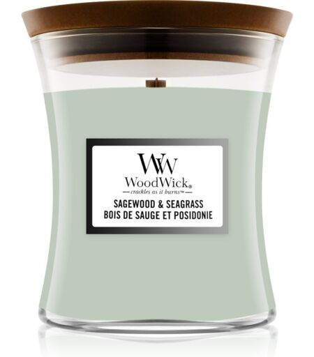 Woodwick Sagewood & Seagrass geurkaars met een houten lont 275 g