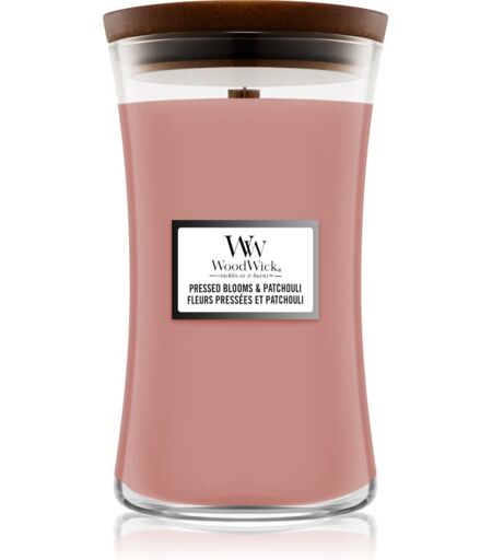 Woodwick Pressed Blooms & Patchouli geurkaars met een houten lont 609.5 g