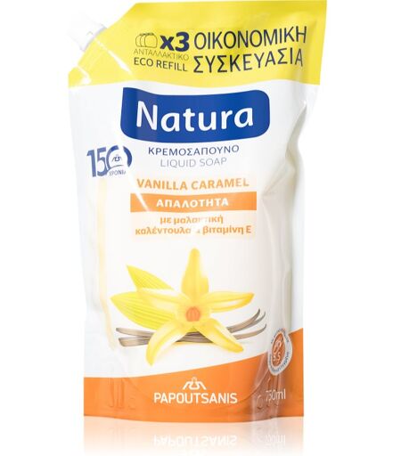 PAPOUTSANIS Natura Vanilla Caramel, 750 ml, Navullingen voor Vrouwen , De vloeibare zeep PAPOUTSANIS Natura reinigt zacht maar effectief de huid van je handen en voorziet van de nodige voeding en verzorging. Kenmerken: reinigt effectief de huid van de handen verzorgt de huid van de handen ruikt aangenaam Hoe te gebruiken: Breng aan op natte handen en laat mild schuimen. Spoel je handen grondig af. ...