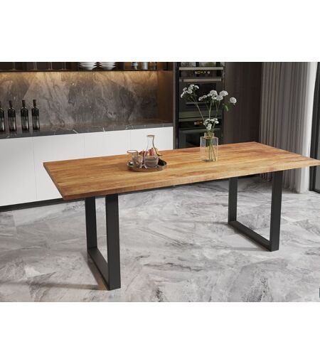 Moderne eettafel mangohout met bruin tafelblad van 45mm dik gecombineerd met zwarte U-poten. De tafelpoten zijn op twee posities aan te brengen. Zie hiervoor de beelden met de afmetingen. Is het de bedoeling om rondom aan te tafel te zitten plaats dan de tafelpoten iets meer naar binnen (positie A) zodat er meer ruimte aan de kopsekanten van de tafel vrij blijft om te zitten. Bij positie B, de tafelpoten zover mogelijk naar buiten creer je veel ruimte om bijvoorbeeld drie stoelen naast elkaar... ...