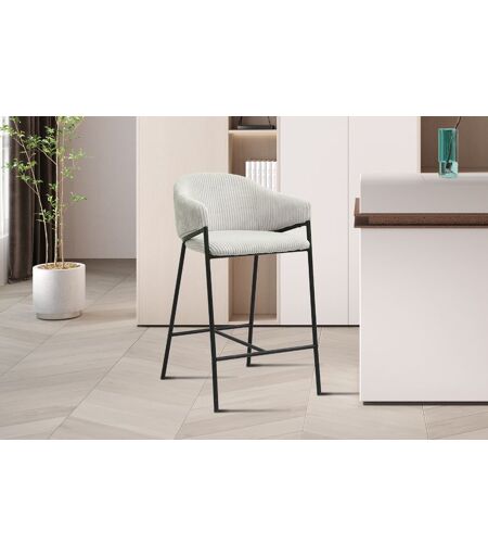 Moderne barstoel met ergonomisch gevormde rugleuning voor een comfortabele zithouding gecombineerd met zwart metalen onderstel. Deze eetkamerstoel is voorzien van een zachte bekleding van stof. Deze barstoel is geschikt voor bartafels van ca 92 cm hoog.Deze barstoel heeft de afmetingen bxdxh:54 x 59 x 92 cmOverige ca afmetingen:Zithoogte 66 cmZitbreedte 54 cmZitdiepte 42 cmKleurcombinatie:lichtgrijs / zwartMaterialen: Bekleding van corduroy stofOnderstel van metaal poedercoating ...