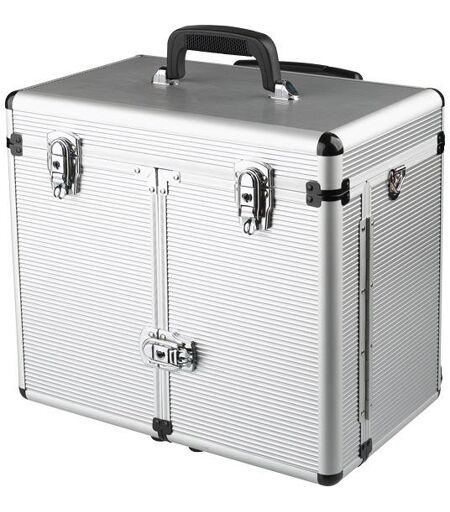 Praktische aluminium koffer op wielen met scharnierende vleugeldeuren. Het slimme handvat beweegt mee met het deksel als de koffer open is. Polyester interieur met naadversterking in alle hoeken, gemakkelijk schoon te maken. Veel functionele vakken voor scharen, kammen en krulspelden. Afmetingen: hoogte 34 cm, breedte 43 cm, diepte 27 cm. ...