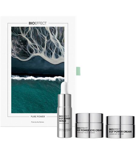 Een heel bijzonder cadeau: het ultieme anti-aging trio van BIOEFFECT, bestaande uit het EGF Power Serum, de EGF Power Oogcrème en een reisformaat van 15 ml van de EGF Power Crème, als set. Samen zorgt deze perfect op elkaar afgestemde huidverzorgingsroutine voor een zichtbaar gladde, stevige en stralende huid. Het EGF Power Serum is een intensief serum dat de huidbarrière versterkt, pigmentvlekken oplicht, rimpels vermindert en hyperpigmentatie en vochttekort compenseert. Het bevat BIOEFFECT EGF, barley-KGF, hyaluronzuur en NAG. Tegelijkertijd minimaliseert de actieve EGF Power Eye Cream fijne lijntjes, donkere kringen, wallen en uitdroging, waardoor de tere huid rond de ogen verfrist en gerevitaliseerd wordt. De diepwerkende EGF Power Cream maakt de routine compleet en helpt rimpels, ouderdomsvlekken en verlies van elasticiteit tegen te gaan met pure, effectieve ingrediënten zoals BIOEFFECT EGF en gerst bèta-glucaan. Belangrijkste ingrediënten BIOEFFECT EGF (Epidermale Groeifactor): Een groeifactor die de natuurlijke collageenproductie van de huid ondersteunt. Dit verbetert de dichtheid van de huid en vermindert rimpels en fijne lijntjes. De huidregenererende eigenschappen zijn essentieel voor een gladde, gezond uitziende huid.BIOEFFECT KGF (Keratinocyte Groeifactor): Een endogene groeifactor of signaalproteïne die helpt de huidbarrière te versterken en gezond te houden. Het is bewezen dat het de regeneratie van de huid ondersteunt en de weerstand helpt te versterken.N-Acetyl Glucosamine (NAG): Een veganistische, bijzonder stabiele vorm van een aminosuiker die van nature voorkomt in de huid. NAG ondersteunt de lichaamseigen productie van hyaluronzuur en helpt de teint zichtbaar te verhelderen en hyperpigmentatie te minimaliseren. Het heeft ook een antioxiderende werking, versterkt de huidbarrière, verbetert de elasticiteit en beschermt tegen vochtverlies.Hyaluronzuur: Een essentiële molecule die van nature voorkomt in de huid en fungeert als vochtinbrenger. Het bindt grote hoeveelheden water en zorgt voor intensieve hydratatie. Hoogmoleculair hyaluronzuur wordt gebruikt in EGF Power Serum om het huidoppervlak onmiddellijk te hydrateren - voor een gladmakend, voller en steviger effect.Gerst bèta-glucaan: Een verzachtend actief ingrediënt met een bewezen effect op de huidbarrière. Bèta-glucaan sluit vocht in, bestrijdt rimpels en UV-schade en bevordert regeneratie. Studies tonen aan: Bèta-glucaan op basis van gerst biedt tot drie keer meer antioxidantbescherming dan bèta-glucaan op basis van haver.Oridonin: Een nieuw plantaardig actief ingrediënt met antioxiderende en regeneratieve eigenschappen, bekend uit de traditionele geneeskunde. Het vermindert oxidatieve stress - een van de oorzaken van zichtbare huidveroudering - en werkt synergetisch met EGF om lijntjes te verzachten, een verslapte huid te verstevigen en de teint te revitaliseren.Niacinamide: Ook bekend als vitamine B3. Het verbetert zichtbaar de huidtextuur, egaliseert de teint, herstelt... ...