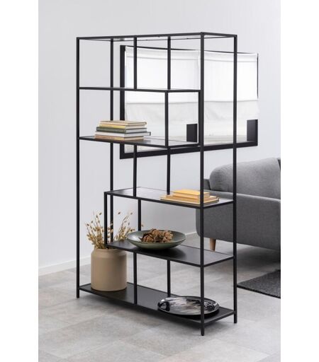 Moderne brede boekenkast roomdivider voorzien van zes verspringende schappen en gecombineerd met zwart poedercoat frame. Deze brede boekenkast roomdivider is verkrijgbaar in de afmeting bxdxh: 114 x 35 x 185 cm Kleurcombinatie: Schappen in zwart essen Frame zwart Materiaal: Schappen van MDF ommanteld met krasbestendige melamine Frame metaal poedercoating ...