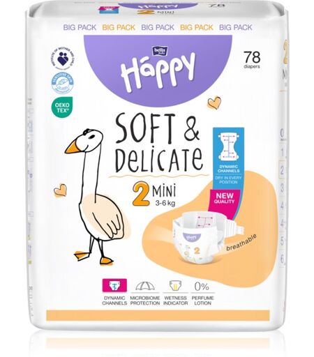 Bella Baby Happy Soft&Delicate; Size 2 Mini, 78 st, Wegwerpluiers voor Kids, Een droge baby is een tevreden baby. De wegwerpluiers Bella Baby Happy Soft&Delicate; Size 2 Mini zorgen voor een gevoel van comfort de hele dag en de hele nacht lang. Ze houden de billetjes van je baby droog zodat je zonder zorgen volledig kunt genieten van elk moment van jullie samenzijn. Kenmerken: snelle absorptie voor een gevoel van droogheid zachte stof aan de buitenkant voorkomen lekken de vochtindicator geeft aan wanneer de luier moet worden vervangen extra ademend materiaal dermatologisch getest – ook geschikt voor pasgeboren baby‘s en een gevoelige huid flexibele sluitstrips vrij van allergenen ...