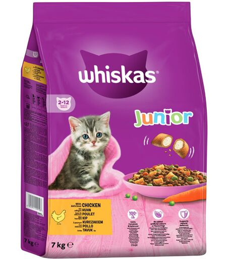 Whiskas Junior is droogvoer voor opgroeiende kittens tot 12 maanden, zorgvuldig bereid, zeer goed verdraagbaar, verhoogd energiegehalte en licht verteerbare proteïne voor een gezonde groei. ...