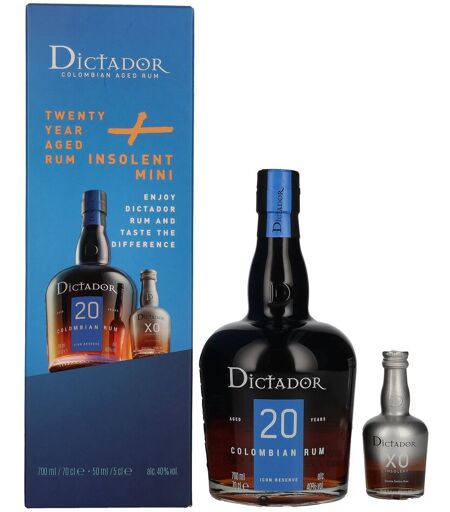 Dictador rum Dictador 20 Years Old ICON RESERVE Colombian Rum 40% Vol. 0,7l in geschenkverpakking met Dictador XO Insolent Miniatur 0,05l