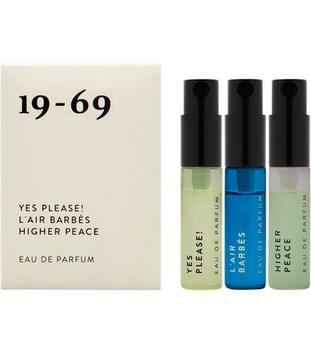Een collectie in zakformaat bestaande uit 3 geuren. Deze set bevat: 1 x Yes Please, Eau de Parfum, 2.5 ml1 x L'Air Barbès, Eau de Parfum, 2.5 ml1 x Higher Peace, Eau de Parfum, 2.5 ml Elke geur is geïnspireerd op een ander tijdperk, cultuur of omgeving in Afrika, Europa, de VS en Azië. Kunst, muziek, trends en culturen hebben hun stempel gedrukt op de geuren, zowel qua inhoud, naam als verpakking. De glazen flacons zijn gelakt en gezeefdrukt in Italië. Elk 19-69 product is handgemaakt, dus kleine variaties horen bij het karakter. Alle grondstoffen worden zorgvuldig getest en geselecteerd om de beste kwaliteit te garanderen. Voor elke geur is er een unieke geurreis. ...