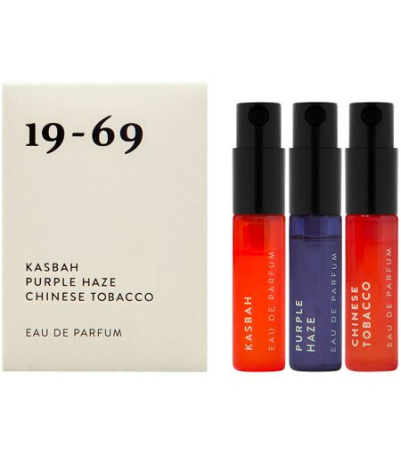 Een collectie in zakformaat bestaande uit 3 geuren. Deze set bevat: 1 x Kasbah, Eau de Parfum, 2.5 ml1 x Purple Haze, Eau de Parfum, 2.5 ml1 x Chinese tabak, Eau de Parfum, 2.5 ml Elke geur is geïnspireerd op een ander tijdperk, cultuur of omgeving in Afrika, Europa, de VS en Azië. Kunst, muziek, trends en culturen hebben hun stempel gedrukt op de geuren, zowel qua inhoud, naam als verpakking. De glazen flacons zijn gelakt en gezeefdrukt in Italië. Elk 19-69 product is handgemaakt, dus kleine variaties horen bij het karakter. Alle grondstoffen worden zorgvuldig getest en geselecteerd om de beste kwaliteit te garanderen. Voor elke geur is er een unieke geurreis. ...