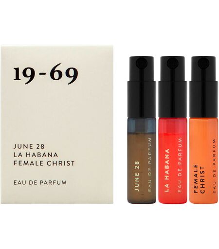 Een collectie in zakformaat bestaande uit 3 geuren. Deze set bevat: 1 x June 28, Eau de Parfum, 2.5 ml1 x La Habana, Eau de Parfum, 2.5 ml1 x Female Christ, Eau de Parfum, 2.5 ml Elke geur is geïnspireerd op een ander tijdperk, cultuur of omgeving in Afrika, Europa, de VS en Azië. Kunst, muziek, trends en culturen hebben hun stempel gedrukt op de geuren, zowel qua inhoud, naam als verpakking. De glazen flacons zijn gelakt en gezeefdrukt in Italië. Elk 19-69 product is handgemaakt, dus kleine variaties horen bij het karakter. Alle grondstoffen worden zorgvuldig getest en geselecteerd om de beste kwaliteit te garanderen. Voor elke geur is er een unieke geurreis. ...