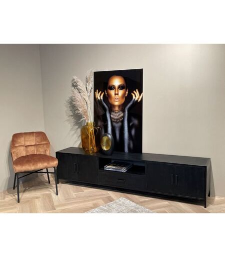 Trendy vintage tv meubel met deuren en lade. Het meubel is gemaakt van mangohout Het betreft een handgemaakt natuurproduct. Noeste en bollingen in het hout alsmede afwijkingen in het metaal zijn onderdeel van het karakter van dit meubel. Afmetingen: Breedte:220 cm Diepte: 40 cm Hoogte: 50 cm Kleur: zwart Materialen: Bovenpaneel, deuren & lade van mango hout zijkanten & frames van gecoat metaal ...