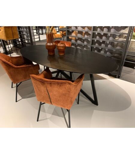 Moderne ovale massief houten eetkamertafel van acaciahout gecombineerd met metalen zwart design onderstel. Het tafelblad heeft een glad oppervlak en een schuin aflopende rand. Dit artikel is bestelbaar in de afmeting bxdxh: 200 x 100 x 76 cm Kleurcombinatie: Tafelblad zwart Poten zwart Materialen: Tafelblad van acacia hout zwart gelakt Poten van metaal ...