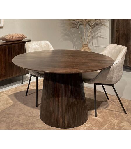 Deze ronde eettafel walnoot 130 cm is een massief houten eetkamertafel met tafelblad van verfijnd glad mangohout en sfeervolle kegelvormige kolomvoet. Een pronkstuk in uw woning of bedrijfsruimte! Combineer deze tafel met de andere meubelen uit dit woonprogramma! Deze tafel is verkrijgbaar in de afmeting Ø x H: 130 x 76 cm Kleurcombinatie: Tafelblad en kolomvoet in donkerbruine walnoot finish Materialen: Tafelblad van... ...