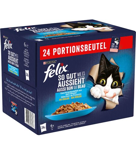 Felix Elke Dag Feest in Gelei Kattenvoer 24 x 85 g. Verschillende heerlijke smaken, malse en sappige stukjes in heerlijke gelei, in handig maaltijdzakje. ...