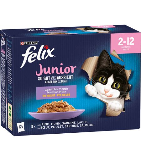 Felix Elke Dag Feest Junior Selectie in Gelei - lekkere en volwaardige gelei maaltijd voor kittens tijdens de eerste 12 maanden, rijk aan eiwitten, vitaminen en mineralen, mix uit vier geweldige smaken ...