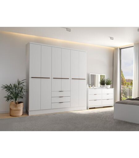 Berg uw spullen in schoonheid op met kast PEROLI! Achter de zes deuren zitten ruime hangkasten en vakken. Er zijn ook drie lades. Op dit meubel kunt u rekenen om uw slaapkamer netjes en elegant te houden. Details Kleur (tint): Wit Materiaal: Spaanplaat 6 deuren Draaideur Soort kast: 3 laden, 5 linnenkasten, 2 kledingstangen Maximale kastbelasting: 8 kg Schuiflade Installatietype: Aan de muur te bevestigen Meubel om zelf in elkaar te zetten Maximaal draagvermogen van een legplank: 8 kg Maximaal draagvermogen van een lade: 8 kg Afmetingen Lengte: 180 cm Hoogte: 206 cm Diepte: 46.5 cm Lade: L59,1 x D53,4 x H35 cm Kleine deur: L29,4 x H135,4 cm Grote deur: L29,4 x H188,2 cm Levering De levertijd van dit product zal worden bevestigd in de winkelwagen. Wij raden u aan om bij de levering goed het aantal geleverde pakketten te controleren. Pakket Pakket nummer 1: Lengte 219 cm, Breedte 51 cm, Hoogte 11 cm, Gewicht 49 kg, Pakket nummer 2: Lengte 202 cm, Breedte 66 cm, Hoogte 9 cm, Gewicht 47 kg, ...
