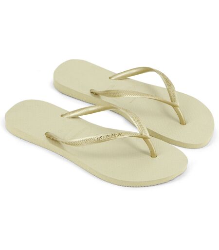 Verhoog uw tempo met de beige Havaianas Slim. Deze schoenen verfraaien uw gang door delicatesse en comfort te combineren. Perfect voor trendvolgers, ze passen moeiteloos bij een hedendaagse garderobe. Een verfijnde keuze voor een verfijnde silhouet. ...